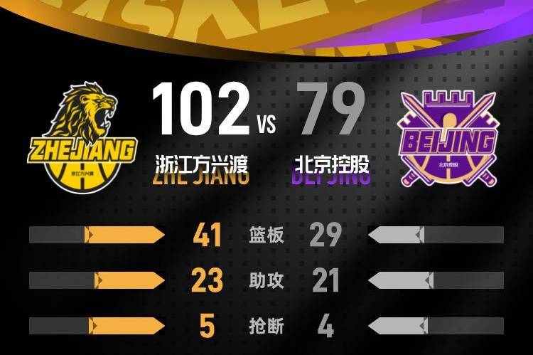 第四节,北京控股进入状态不佳,曾一度落后38分。虽然在节中发起反击将分差缩小至23分,但浙江方兴渡的进攻依然保持高效。随后的时间里,浙江方兴渡稳扎稳打,保持着明显的优势。最终,浙江方兴渡以102-79战胜北京控股,赢得比赛胜利。